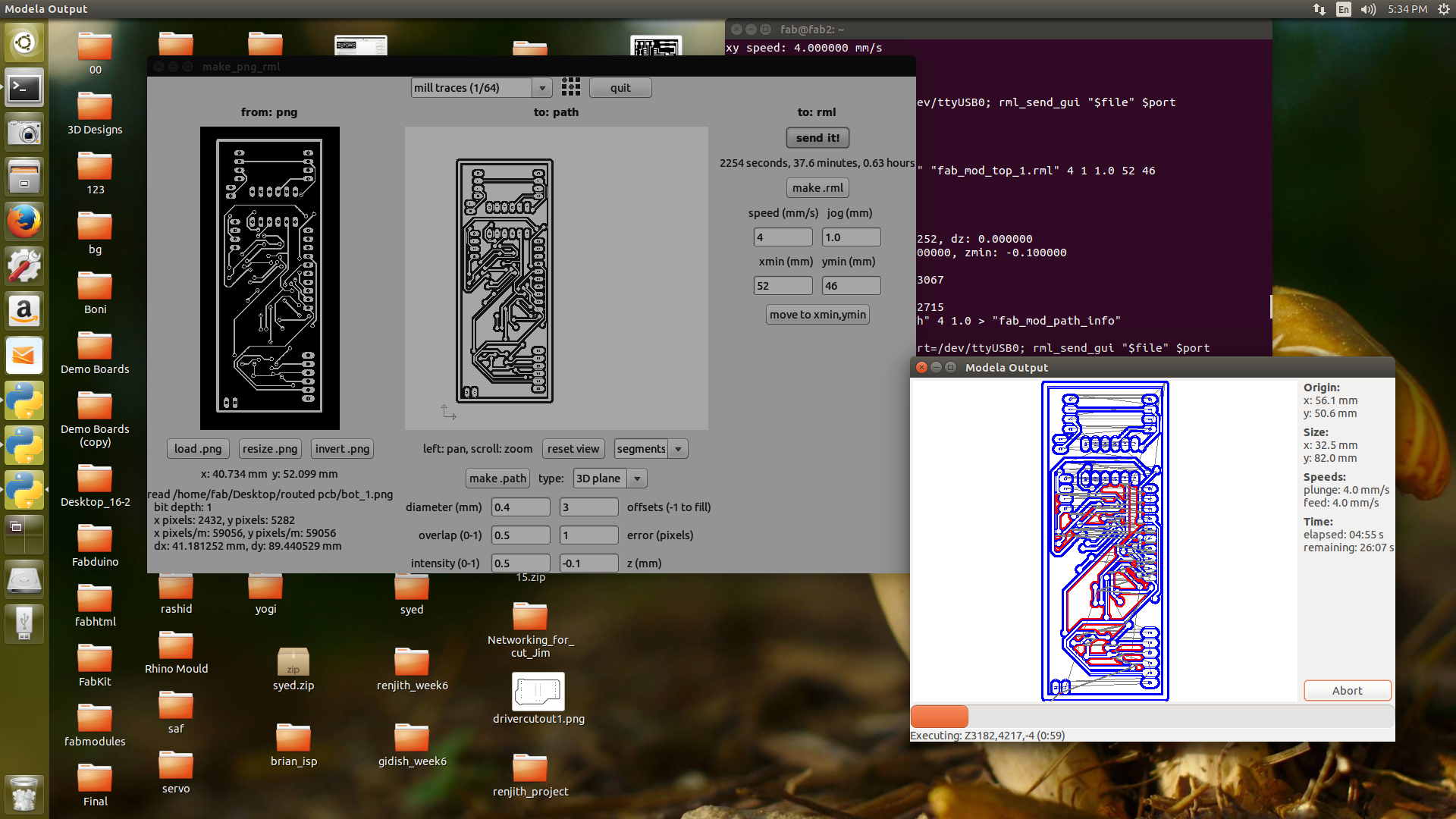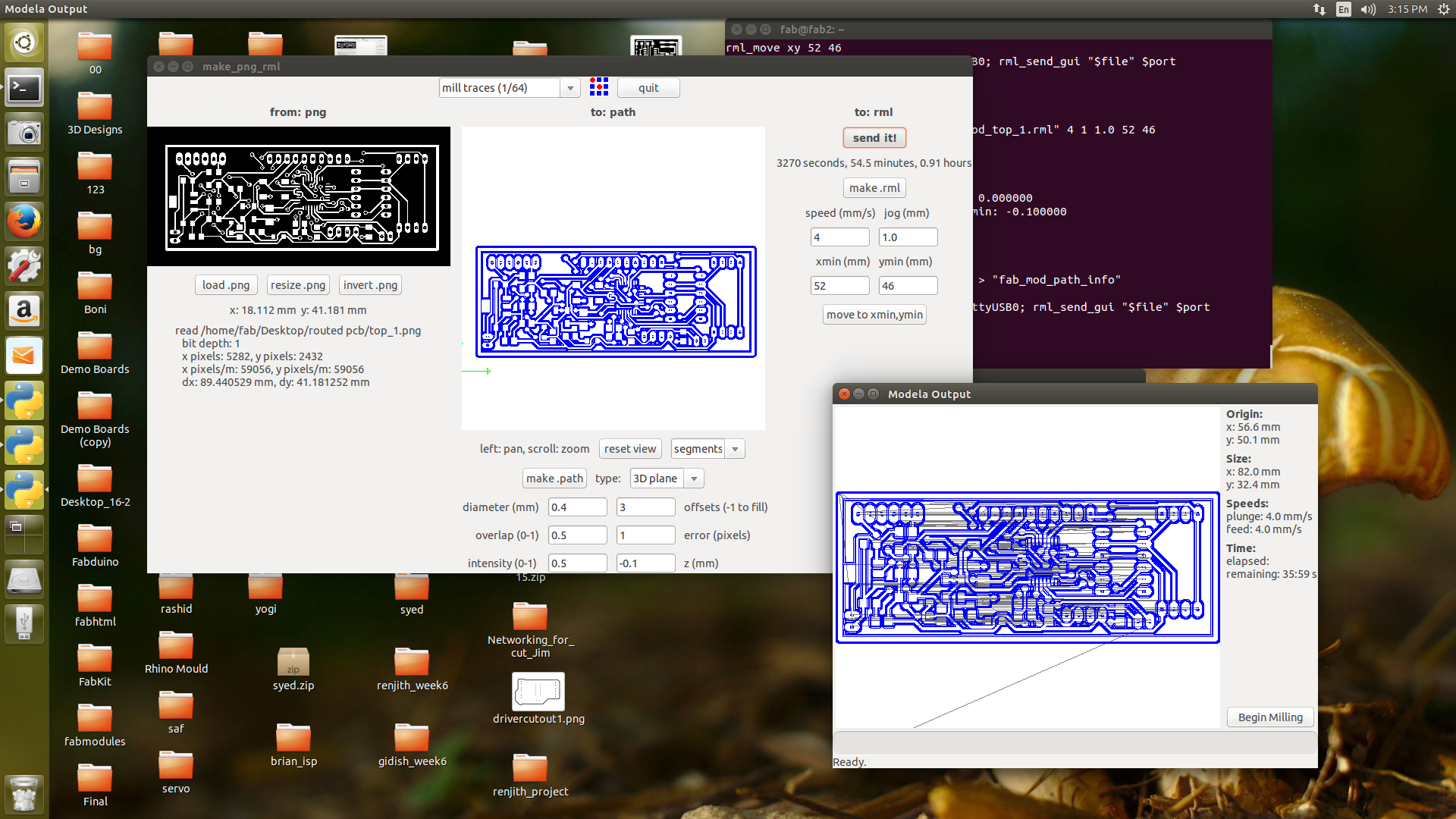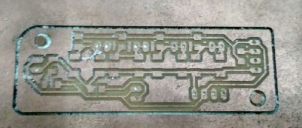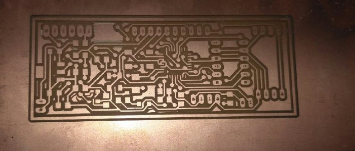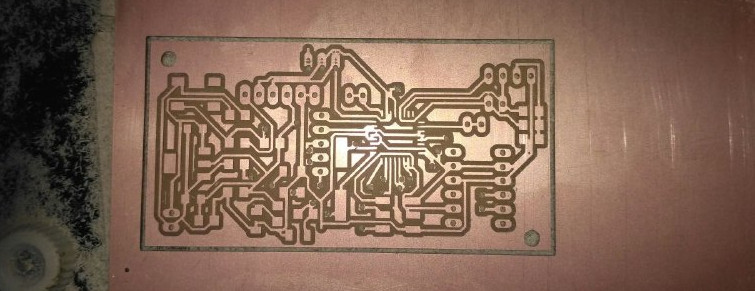 The top layer png image were opened in fab modules and milled the board using 1/64 (0.4mm) bit. The pcb milling of top layer and after the completion of toplayer is shown in the below image.