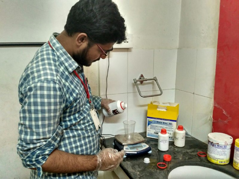 The mixing proportion of the material is 100:50, I had taken 200 grams of epoxy A part and 100 grams of epoxyB part in a plastic glass and mixed it very well with the wooden stirrers. Don't forget to take the safety precausions while using the epoxy. You have to wear apron sheets, eye glasses, gloves etc.