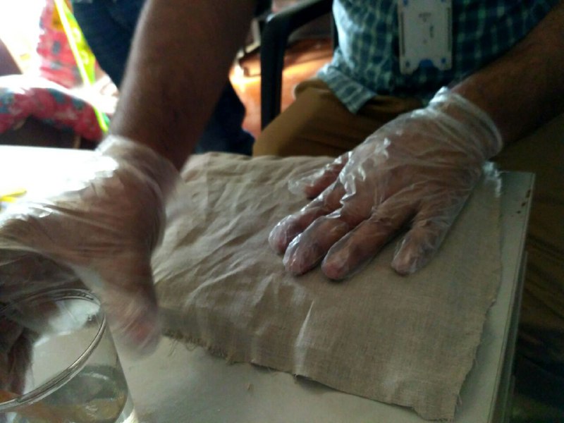 After that, shaped cotton lint was dipped in the mixture and placed in the mold as first layer then in the next layer burlap was put. Like this four layers i made and in the final layer one more cotton swap was layered using my hands i spreaded the resin throughout.