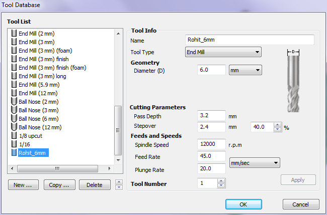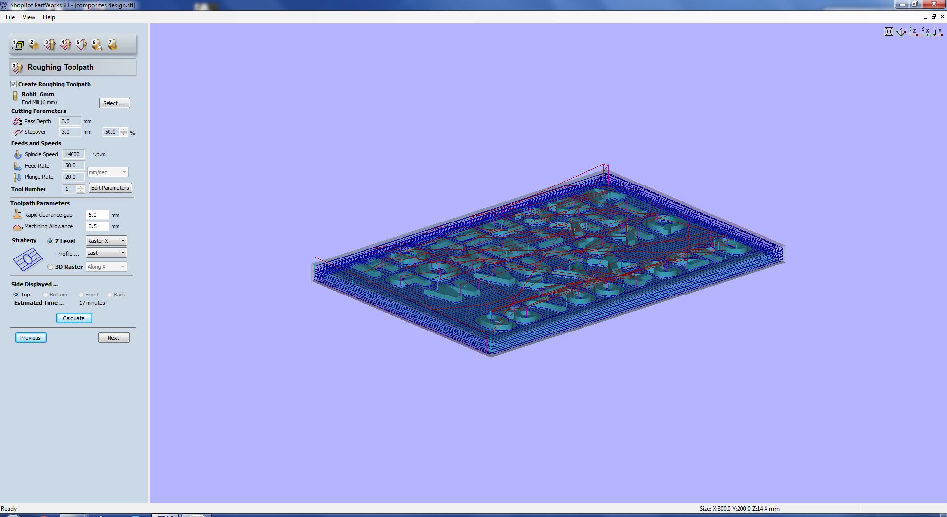 Step3: Next is the roughing toolpath creation, In this step we can select the bits we are going to use in my case i have selected a 6mm flat end mill for doing roughing. we can directly change the tool parameters and other stratergies from this window. After setting the parameters we can simulate the profile to know about the time estimate. It showed 17mins for me. We can jump to the next step by just clicking the next button also we can go back to a previous step by pressing the previous button. The parameters given for 6mm bit is showed in the next image.