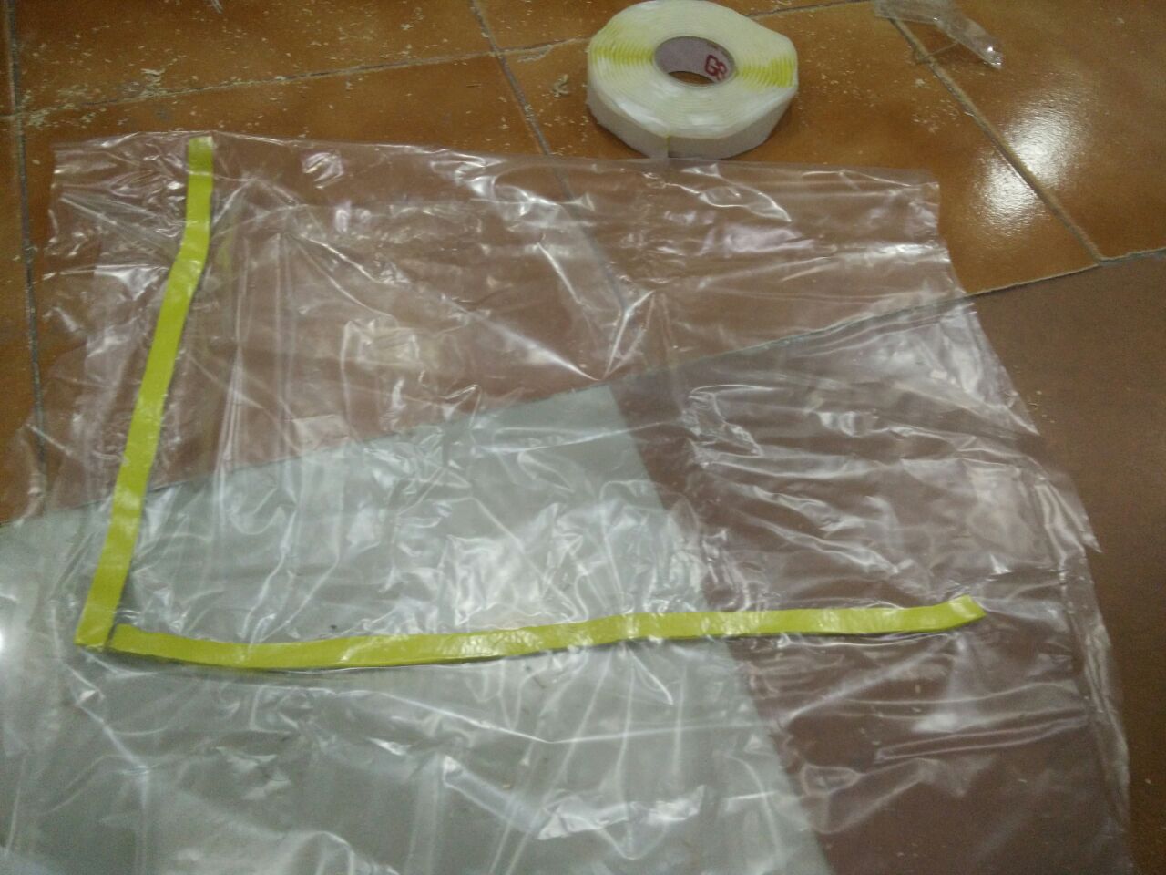 Vaccum bagging uses a vaccum pump to extract air from inside of the polythene bag where the casted composite mold is placed and compress the part under atmospheric pressure inorder for the compacting and hardening process to takes place. We can use the vaccum sealed storage bags with seals, Some bags are available here from the last academy but it was leaky. I planned to make a vaccum bag with polythene bleeder release bag and vaccum sealing tape. Required dimension of bag sheet are cut using scissors and made the bag by sticked the sides using vaccum seal.