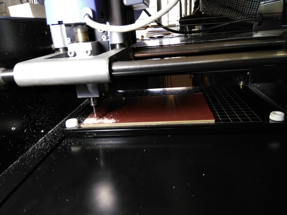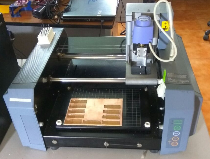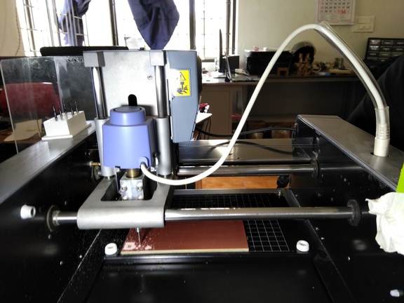 We used the Modella MDX20 to machine our PCB. Modella is a Desktop milling machine that is capable of milling wax, MDX,and circuit board planks.It has a small bed which moves in the Y-axis, a Tool head which moves in the X-axis and the end effector which moves in the Z-axis. It supports many milling bits and is easy to use. The machine itself has a tiny foot print and can be placed on a table. we controlled the device using the Fab Modules. you can find more about the machine here