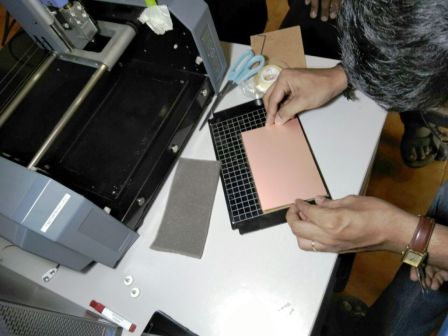First we have to set the work plate. The work plate is mounted to the table through two screws. Here work plate is acting as "Y". The work plate can be moved outword by pressing the view mode in the machine unscrew and take out the workplate over this plate we have to fix our bare copper sheet using transparent double side tape. It is better to provide a sacrificial layer inbetween the plate and board will ensure more safety to the machine and bits. Here we used a large single side pcb because for total 9 peoples we can use this single board.