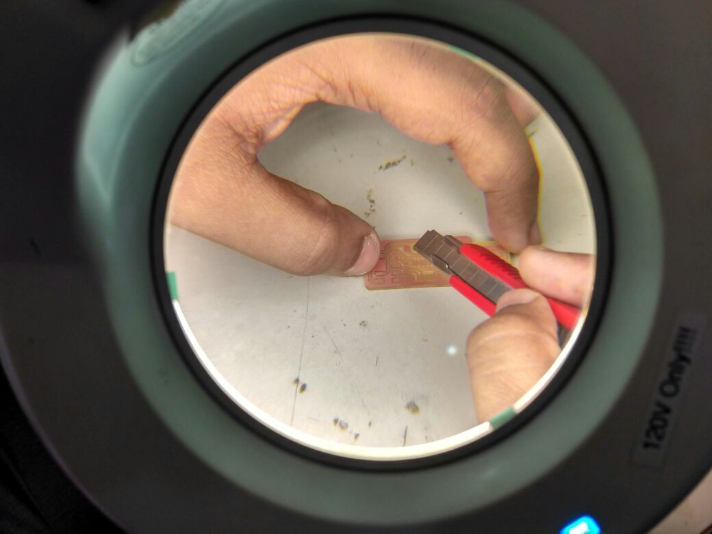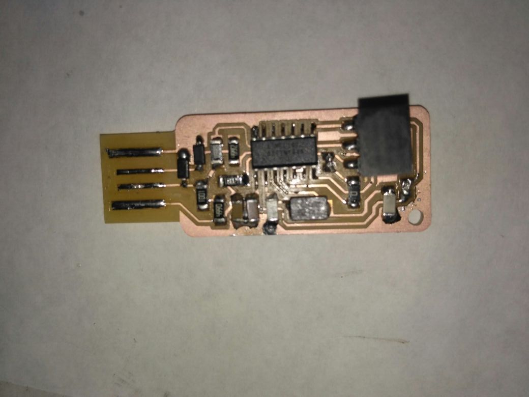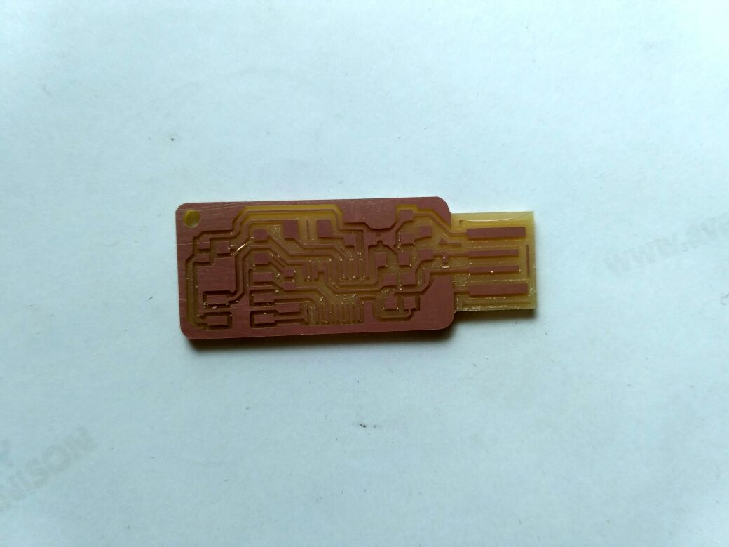 Then i have done the post processing removed the excess copper still reamianed where milling is not possible then ,i have sucessfully soldered but later in hurry i made a mistake and the trackes of the board where missing then i thought to build another board which has less components as all other friends done with brain so i decided to make the brain Mistake done by me is i thought to add a LED from outside to know the status of the ISP as andy's design has no indicator i have placed the LED but forget to add a resistor to it thus it blown and track was got depriciated