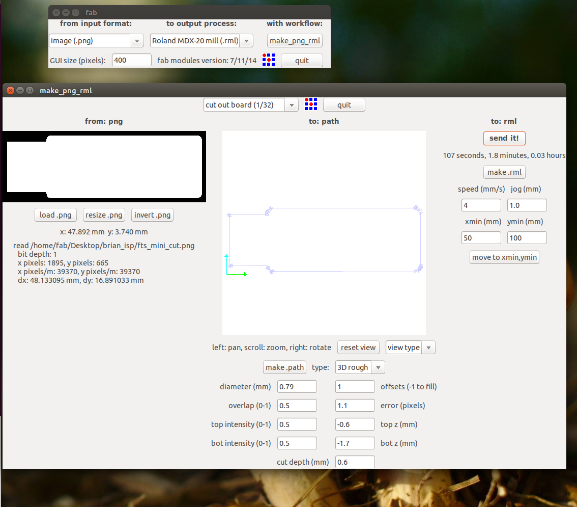 Then we choose the .png and Modela MX-20 (.rml) and we make it