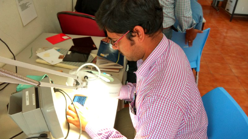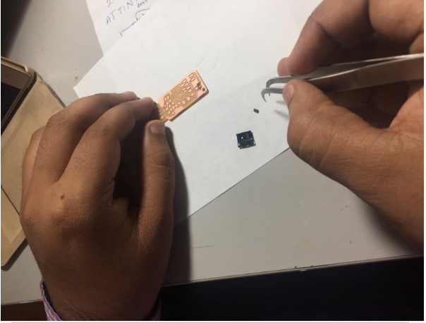 • Thus after the cleaning of the board i have started using the soldering iron and the soldering Led i place the ATTiny44 as this is with more legs and alignment is difficult as suggested by the instructor vishnu and he also given tip to easy solder though i am good at through hole soldering this was my first time doing SMD soldering Tip ! place soldering rod at the solder pad 5sec and then take the soldering led near to it ,as it takes the solder little and uniformly