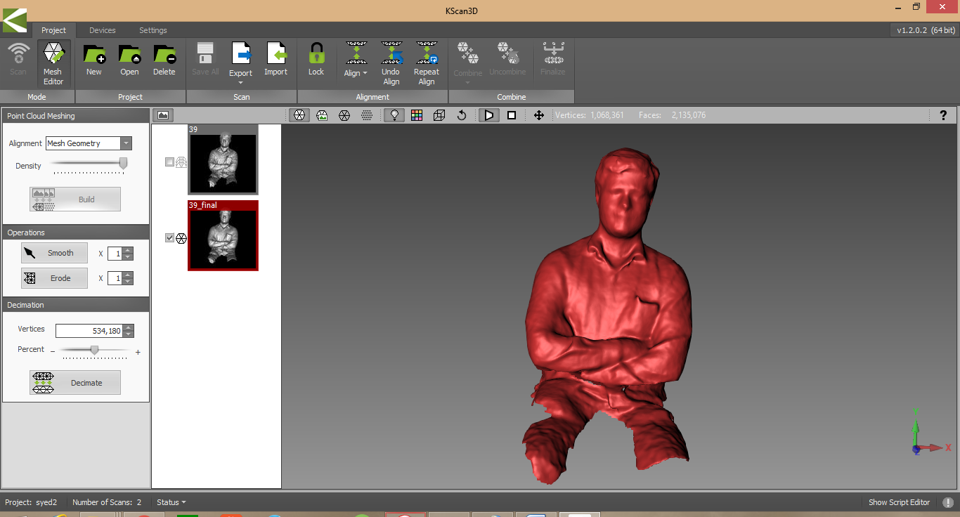 I really like in reconstructme was that option for selfiescan. In which a person sat infront of the sensor and turned around a full 360 and the software would map the 3D profile. This worked well enough and the 3D model it generated is acceptable. There was a problem for this is that the box confined and there were some minute issues misalignment in the textured model, where the colour reproduction was a bit off. But for a free software it is good enough