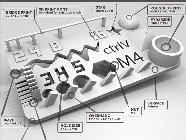 Understanding our 3D printers limitation is the most important thing because this may reflect the actual print quality of our prototypes/products. One of the main parameters is the resolution, it determines the quality of print. I found in Make magazine website regarding a shootout called Digital Fabrication Shootout they have ranked different manufacturers 3D printers. We have downloaded a test print model from thingiverse and is shown below with the test parameters.