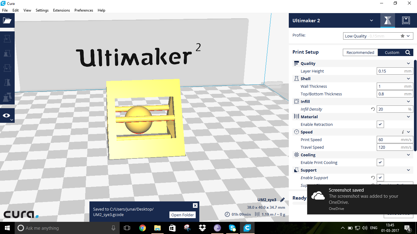 After downloading the file opened the .STL file in cura and printed in Ultimaker2 3D printer. It tooks 30 minutes to print the file in Ultimaker. we printed two times to check the quality of the spool