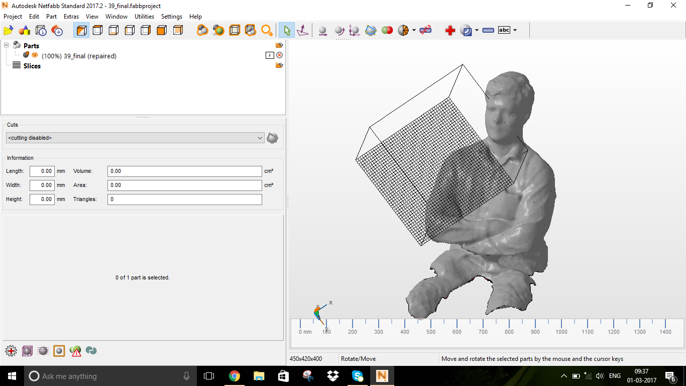 In the first step you have to set your bounding box and the nature (size and orientation) of the item which will be scanned. In the next step place the object in front of the sensor and click record.It will start capturing the 3D data and now either rotate the object of the sensor 360 degrees. The scanned portions will be in green and the rest will be in red. Be careful of moving the sensor too fast as it will lose tracking and you will have to go back to the last position where you lost the tracking.