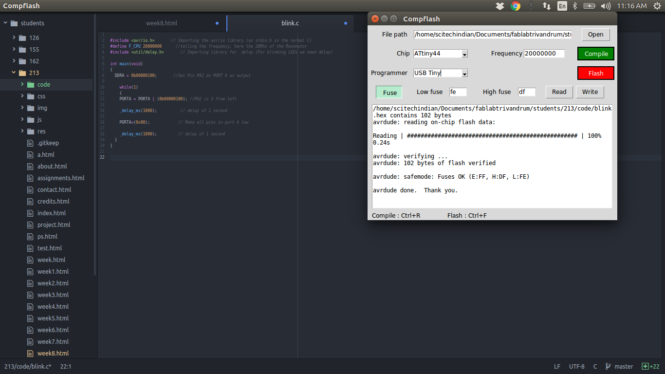 Inorder to compile in avr-gcc and flash the program on attiny44, we may need to run certain commands from the terminal. One of our instructor, Mr.Yadu has developed one User Interface in python language for easy compiling and flashing, it's called Compflash. Its available in the githublink, Compflash. I just cloned it in my PC. It requires certain dependancies, you can install it in your PC using commands. Once cloned,open terminal from the cloned directory, then type python compfalsh.py. It will open the GUI of comp flash like this.